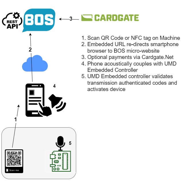 The process begins with the User reading a QRCode or NDEF encoded NFC tag located on the machine with their smartphone. Using the smartphone’s browser and data connection, this action re-directs the user to a specific UMD BOS (Basic Ordering Service) micro-website, where the hire and/or payment process is conducted. Once a digital token token is exchanged, the smartphone can complete the process by transmitting it directly to the offline device or machine. Vendors can create digital tokens to enable or control their device or machine, using the UMD BOS service. The BOS service is hosted by UMD and requires no commissioning or programming by the Vendor only plug and play configuration. If payment is required for activation, BOS seamlessly connects with the Cardgate.Net credit card payment service to facilitate this. The machine or device to be controlled requires the installation of a UMD embedded controller. This controller is used to communicate with the User’s smartphone and also serves to control or activate the machine’s operation. The UMD BOS/Embedded platform is uniquely customised to meet a clients’ specific needs. Applications examples include: