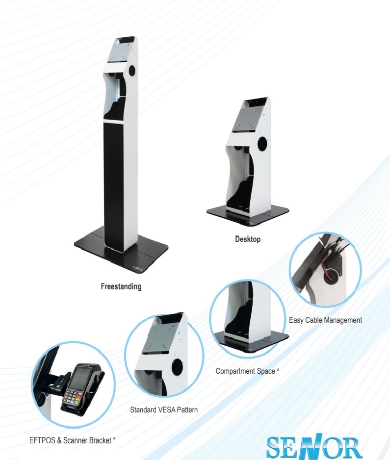 The SENOR MIKI Kiosk Stand is available in a stylish desktop version as well as a full floor mount variation with a appropriately sized weighted base for maximum stability. The 75mm and 100mm VESA mount pattern can easily accommodate upto a 22" screen, or full all in one POS terminal, with clever cable routing holes and channels, as well as suitable mounting options for a variety of peripherals.